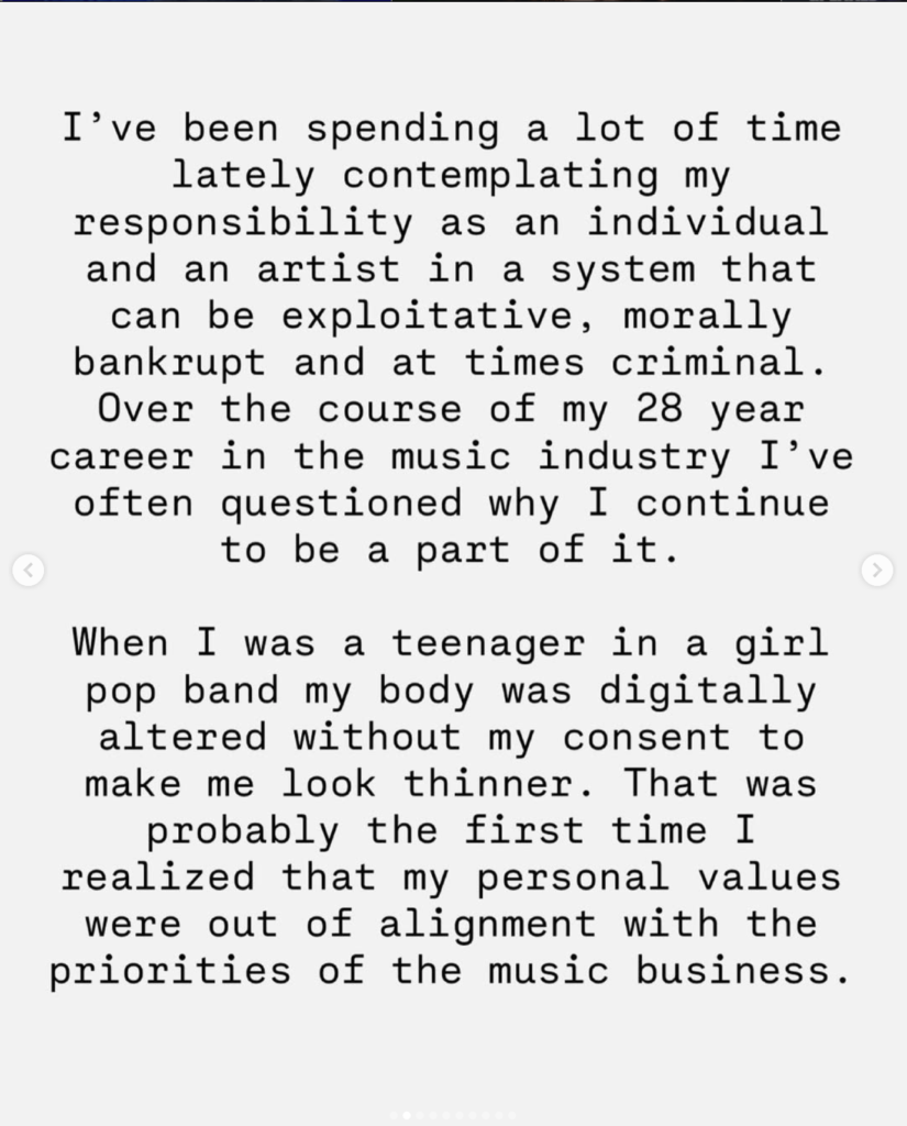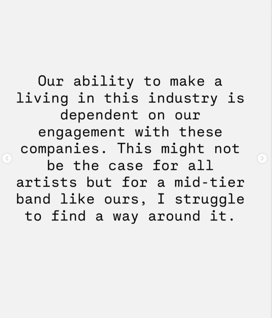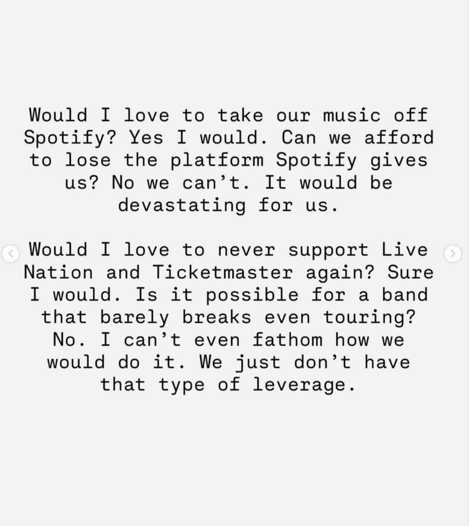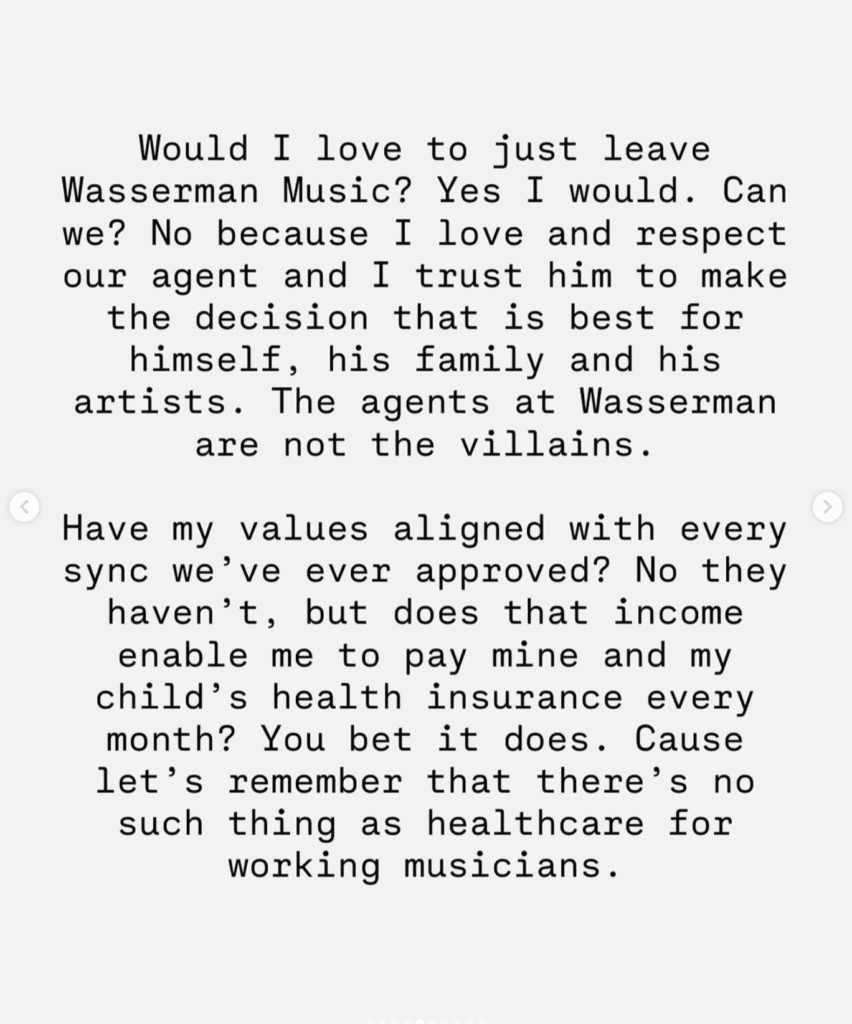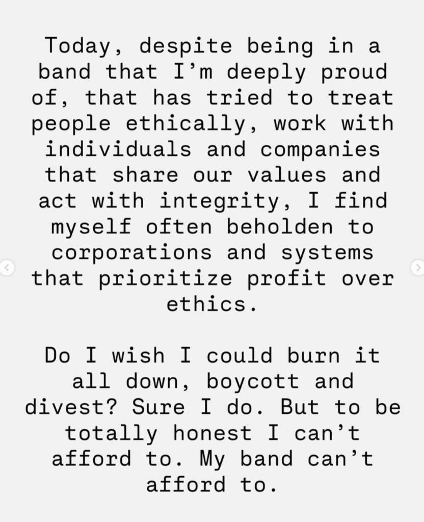 We have to use our creativity outside of what society tells us we’re allowed to build. Building that org, that union or running that venue that treats artists with respect is just as important as that hit song or sold out tour. In this business built on extraction and monopoly, there is the option to comply with or defy exploitation and yes it means sacrifice and risk. We have to use the same amount of courage that helped us carve our own path to then walk away from a system that is hell bent on killing you or at least start constructing alternatives so other people can see that things don’t have to be this way.